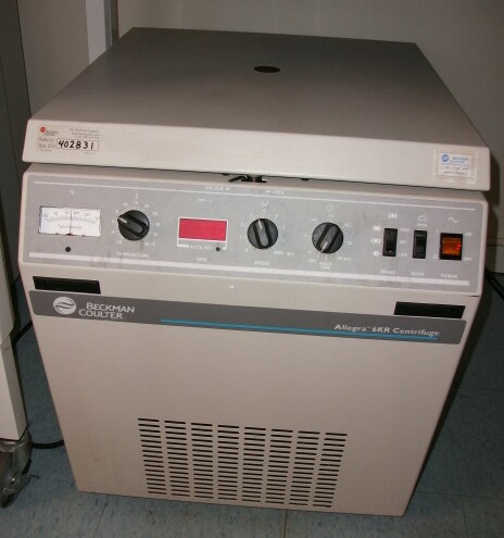 This Beckman Coulter Allegra 6KR refrigerating high-capacity kneewell centrifuge w/GH 3.8 swinging bucket rotor & buckets. Variable speed w/digital readout, max speed 3,750 rpm, -10 to 40C temperature range, high, low, and off brake settings. Buckets can accepts inserts for many sizes of tubes. Kneewell design takes your benchtop centrifuge off the bench, with easy undercounter storage. Very clean.