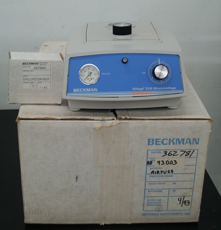 This new Beckman Airfuge CLS comes w/a new Chylomicron Rotor and liner. CLS is a compact, air-driven tabletop ultra centrifuge system from Beckman that can get up to 110,000 rpm. It is the first choice for many clinical laboratories and medical professionals who value consistency and accuracy of the results. The CLS is a simple and extremely rapid method of removing chylomicrons (fat particles in lipemic samples) & is perfect for providing accurate results for lipemic clarification. The special Beckman Coulter Chylomicron Rotor and liner can clean up the lipemic samples in 10 minutes, eliminating the need for sendouts. Also can accept any of the other Airfuge rotors