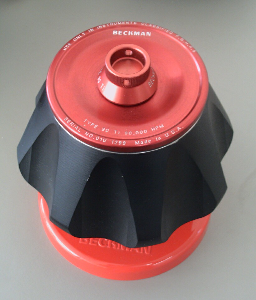 This Beckman Type 90 Ti fixed angle ultracentrifuge rotor to 90,000 rpm, 8 x 13.5 ml capacity has very little use, about 100 hours, with copy of logbook it was used with.