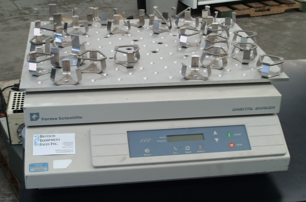 This Forma 416 large-capacity benchtop orbital shaker has an 18" x 24" universal platform which can accept many different flask clamps. Microprocessor control of speed from 25 to 525 rpm, and of time to 200 hrs.