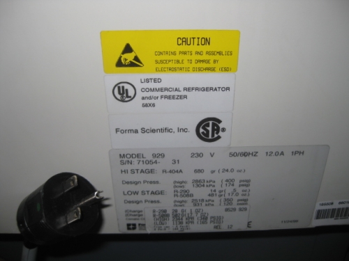 This Forma Model 929 upright ultralow freezer gets to -80C & is 29 cu/ft. It was manufactured in 1999 and is very clean. 230V & Lots of storage!