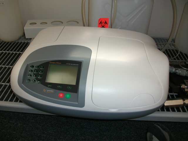 This Amersham Ultrospec 2100 Pro UV/Vis spectrophotometer has a 190-900 nm range, 8-position cell changer, on board LCD microprocessor display, automatic wavelength calibration on start up, serial and parallel Centronics interfaces, & provides stored routines for DNA, RNA and oligonucleotide quantitation and purity check.