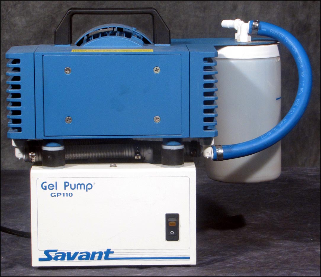 The environmentally friendly design of the Savant GP-110 vacuum pump protects users and eliminates hazardous oil waste. Chemically Resistant Design for use with oil pump destroying solvents. Oil-free vacuum pumps create a vacuum without the need for oil, eliminating the hazards of contaminated oil vapors, oil clean-up and dedicated periodic maintenance of changing oil. Oil-free vacuum pumps are generally much quieter than oil pumps a priority when working within the laboratory environment. They are also much more chemically resistant to vapors passing into the pump. This type of pump is recommended for evaporating samples in acidic environments such as HCl, TFA, Acetic or Formic Acids. Displacement is 36L/min. Maximum vacuum is 7 torr (9mbarr)